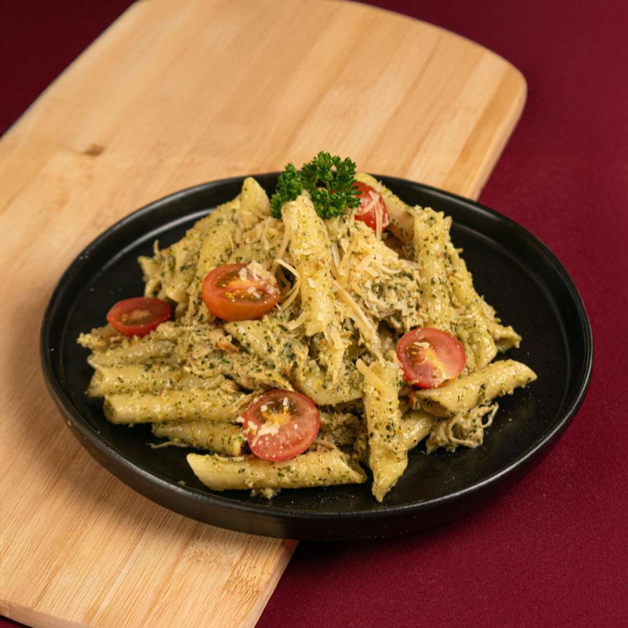 Pasta bañada en salsa pesto hecha con albahaca, cilantro, almendras, ajo y aceite de oliva, acompañada de pollo y tomate cherry fresco. Terminada con queso parmesano y un toque de crema de leche. Incluye tostadas.