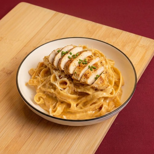 Pasta bañada en salsa de tres quesos preparada con mozzarella, cheddar y queso parmesano, con un toque de vino blanco. Acompañada con 180 g de pollo a la plancha que aporta sabor y buena proteína. Incluye tostadas.