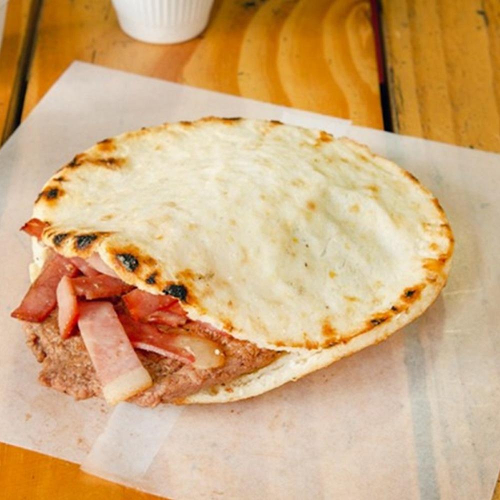 Arepa de maiz rellena con carne de hamburguesa, tocineta y queso