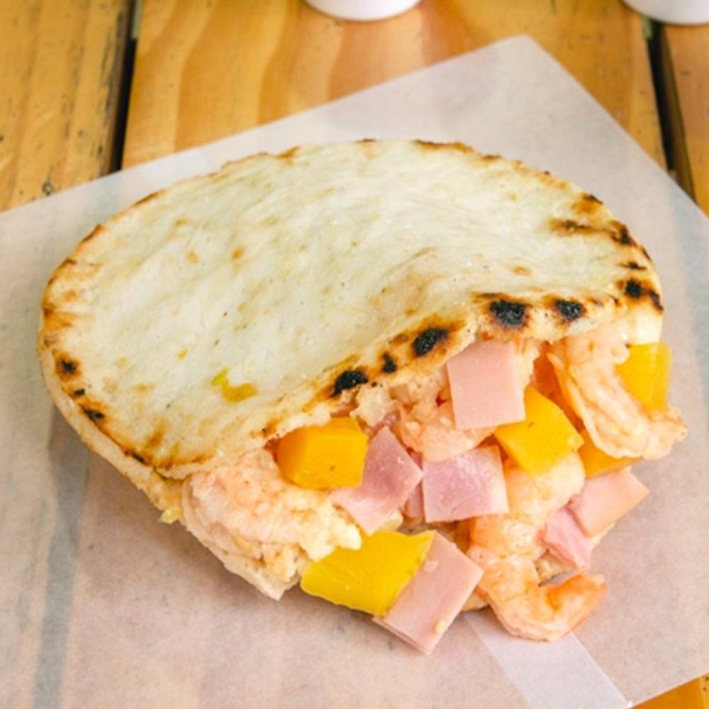 Arepa de maiz rellena con camarones en salsa rosada y cebolla, jamón, piña y queso