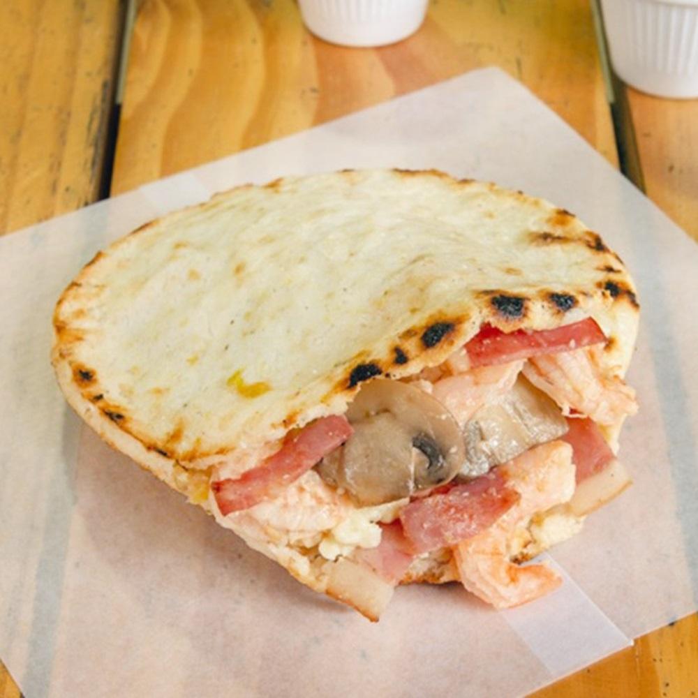 Arepa de maiz rellena con camarones en salsa rosada y cebolla, champiñones, tocineta y queso