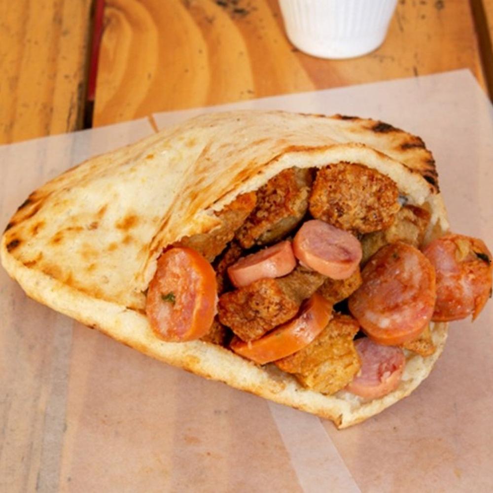 Arepa de maiz rellena con chicharrón, salchicha ranchera, chorizo, maduritos y queso