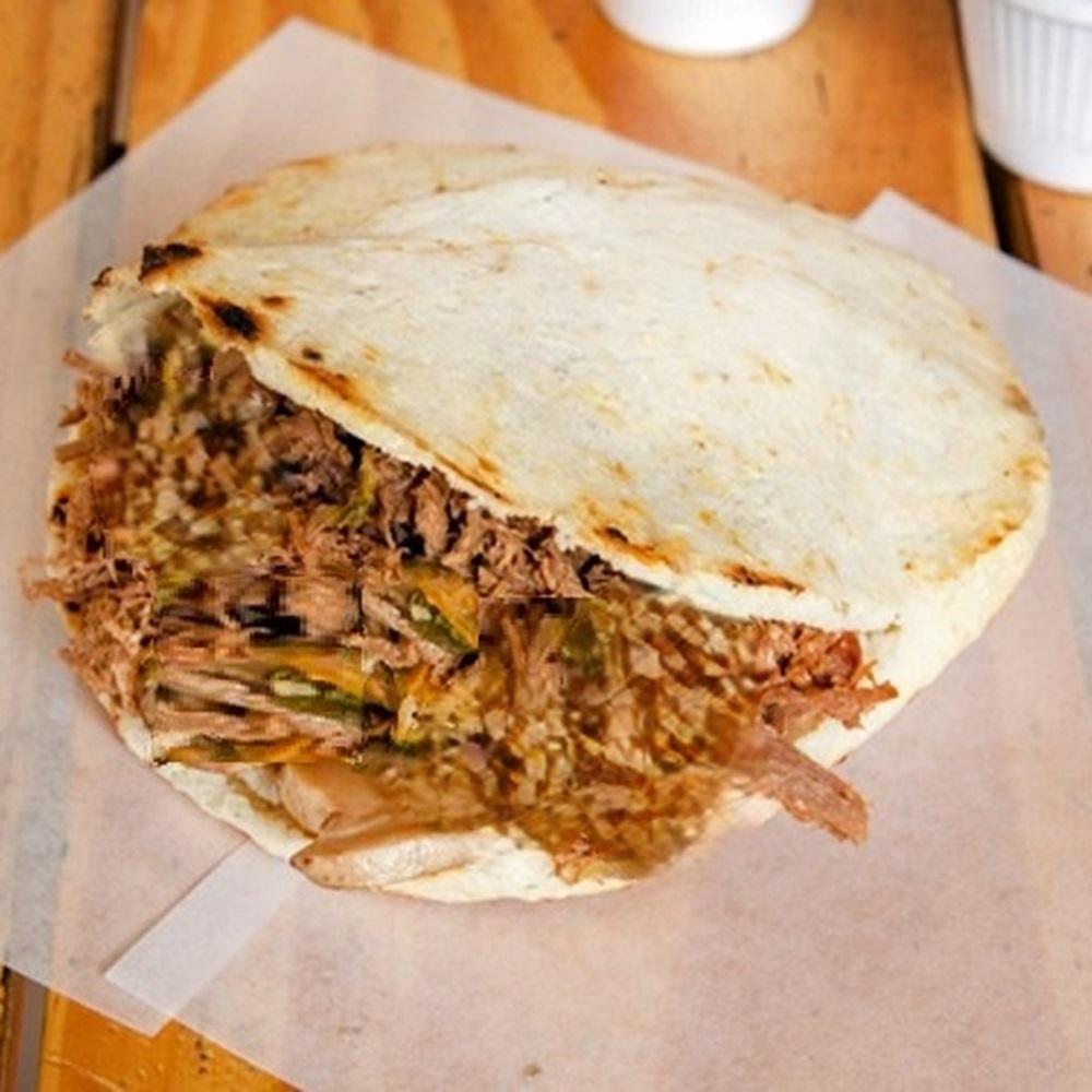 Arepa de maiz rellena con carne desmechada, hogao y queso