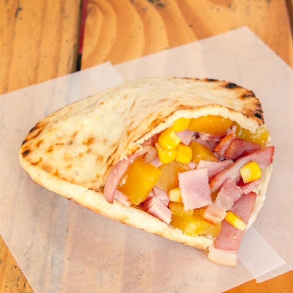 Arepa de maiz rellena con jamón, tocineta, maicitos, piña y queso