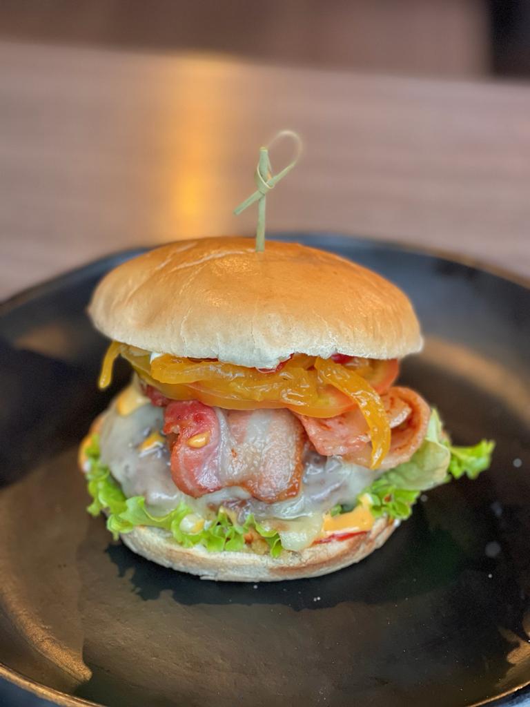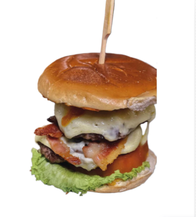 Pan artesanal, carne artesanal, tocineta, queso, cebolla caramelizada, tomate, lechuga, salsas de la casa y poción de papas.