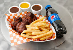 Dos alitas, dos nuggets, dos costillas, papas o nachos, gaseosa.