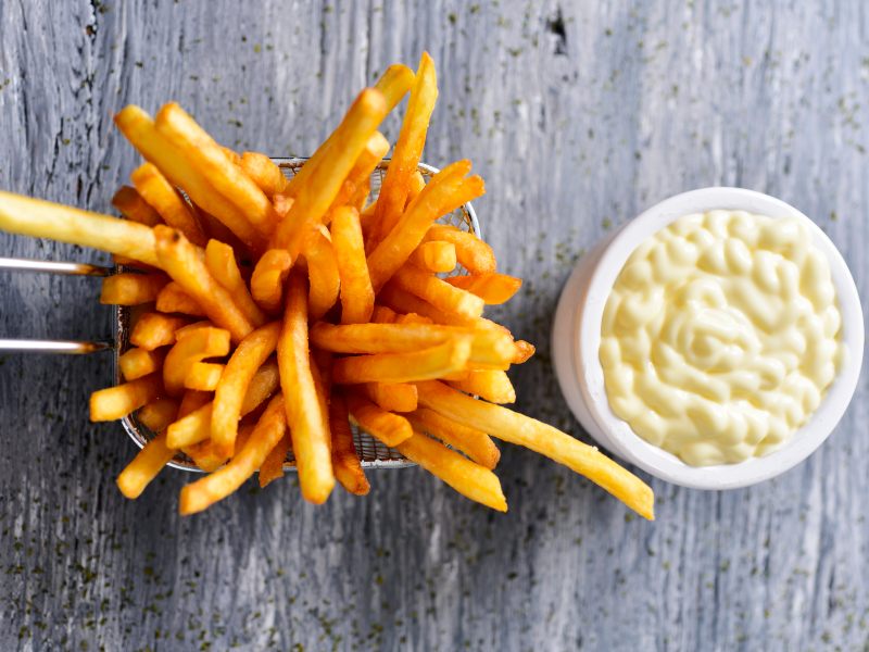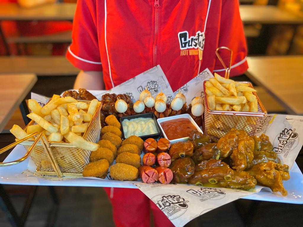 Diez alas, diez costillas, diez chorizos, salchichas, papas, diez huevos y diez nuggets.