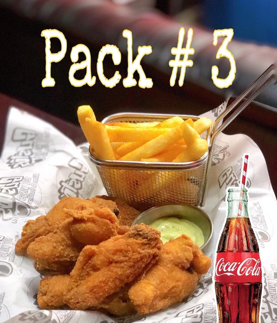 Siete alitas o nuggets , papas o nachos, gaseosa.