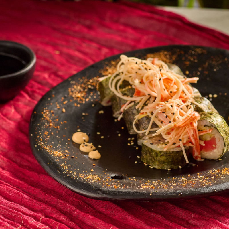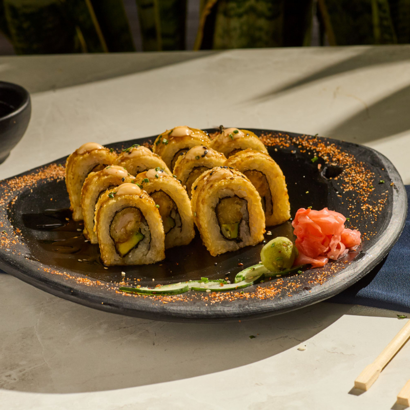 Delicioso roll apanado a base de plátano maduro, camarones apanados, aguacate y cangrejo.