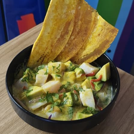 200 gr de pesca blanca, mezclados y marinados en aji amarillo, acompañado de chips de platano verde, finalizado con cilantro. (picante medio)
