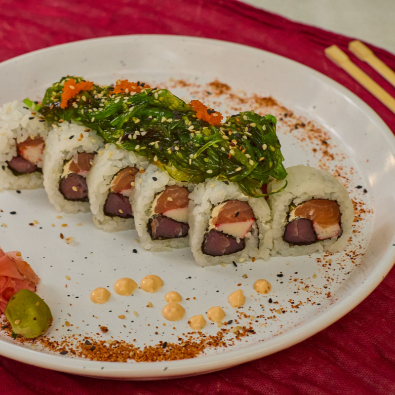 Roll premium de la casa, tilapia fresca, salmón, kanikama y aguacate, finalizado con una ensalada de wakame.