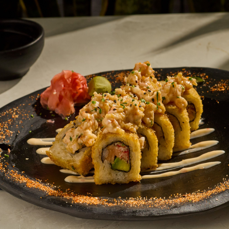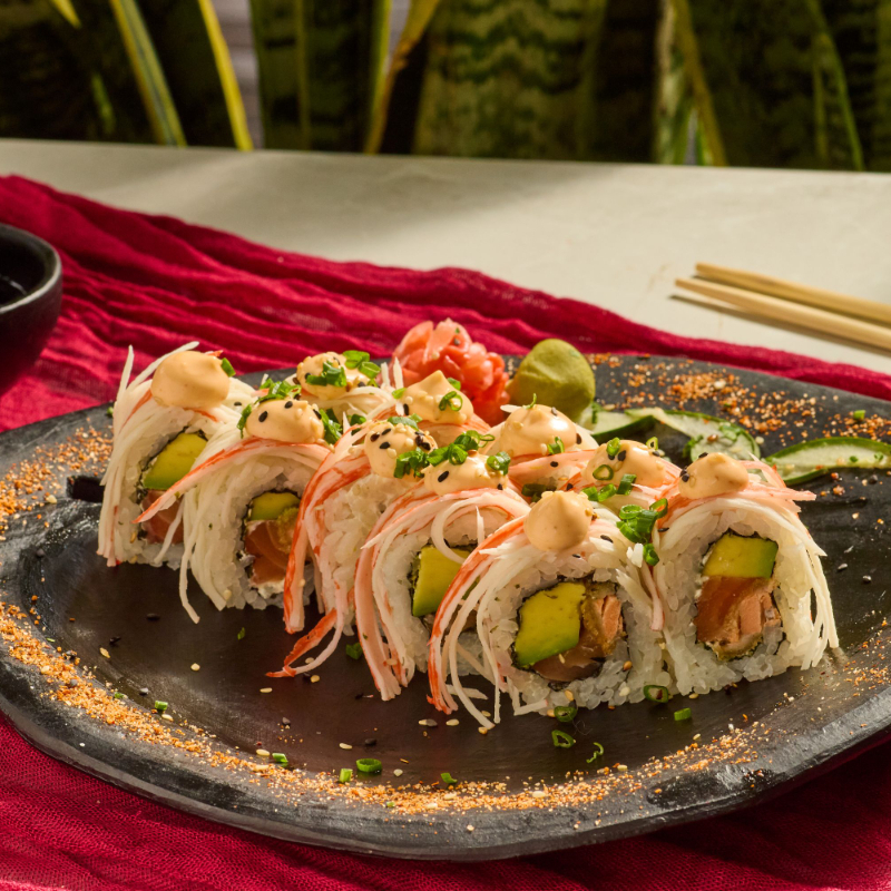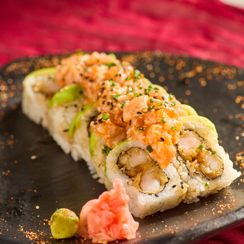 Delicioso roll tempura, salmón, queso crema y aguacate, finalizando con una ensalada dinamita de topping.