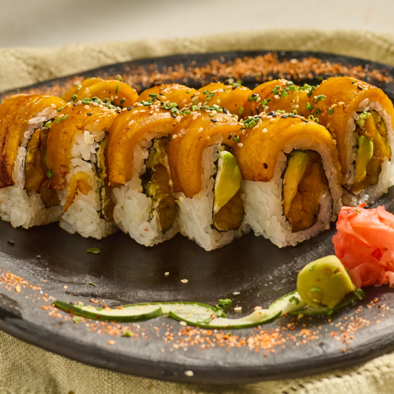 Palmitos de cangrejo, queso crema y aguacate, topping de camarones, salsa dragón y teriyaki.