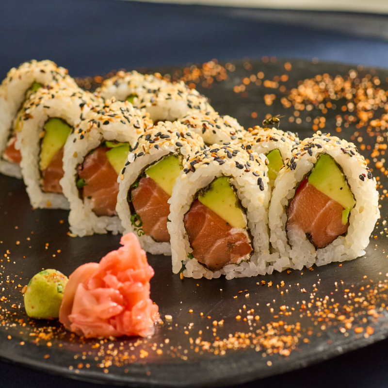 Clásico philadelphia al estilo hamachi, salmón fresco, queso crema y aguacate finalizando con ajonjolí.