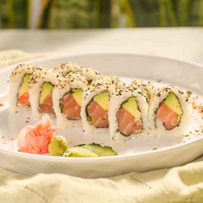 Salmon fresco, aguacate y queso crema. Topping ajonjolí.