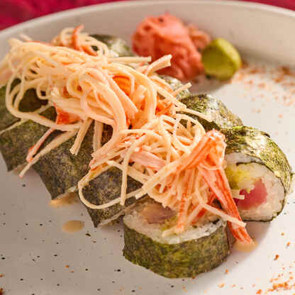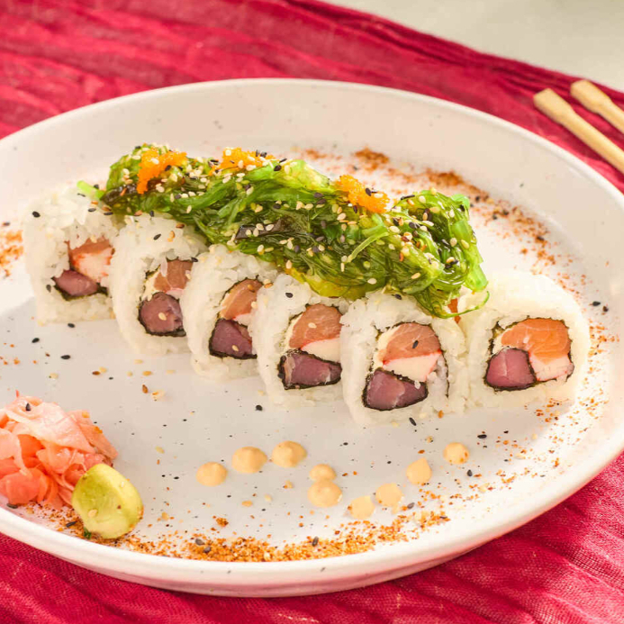 Delicioso Roll de atun, salmon, kanikama y finalizado con topping de wakame y caviar