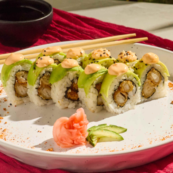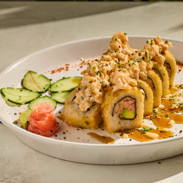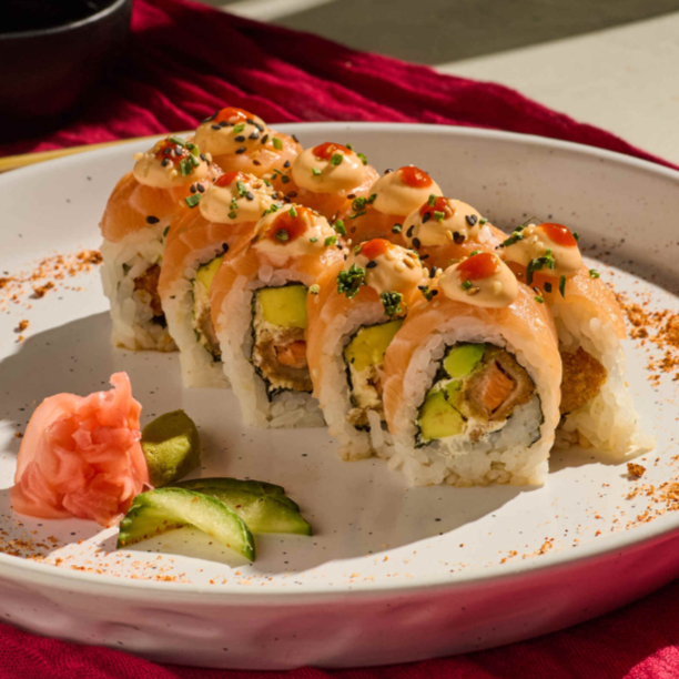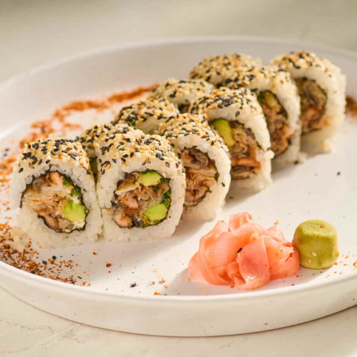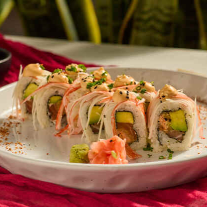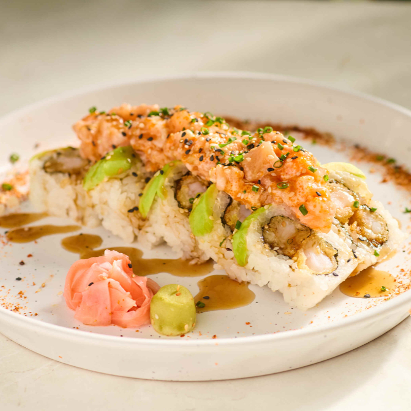 Delicioso Roll de ensalada dinamita, salmon fresco, aguacate. finalizado con tartar de camarones