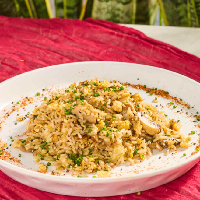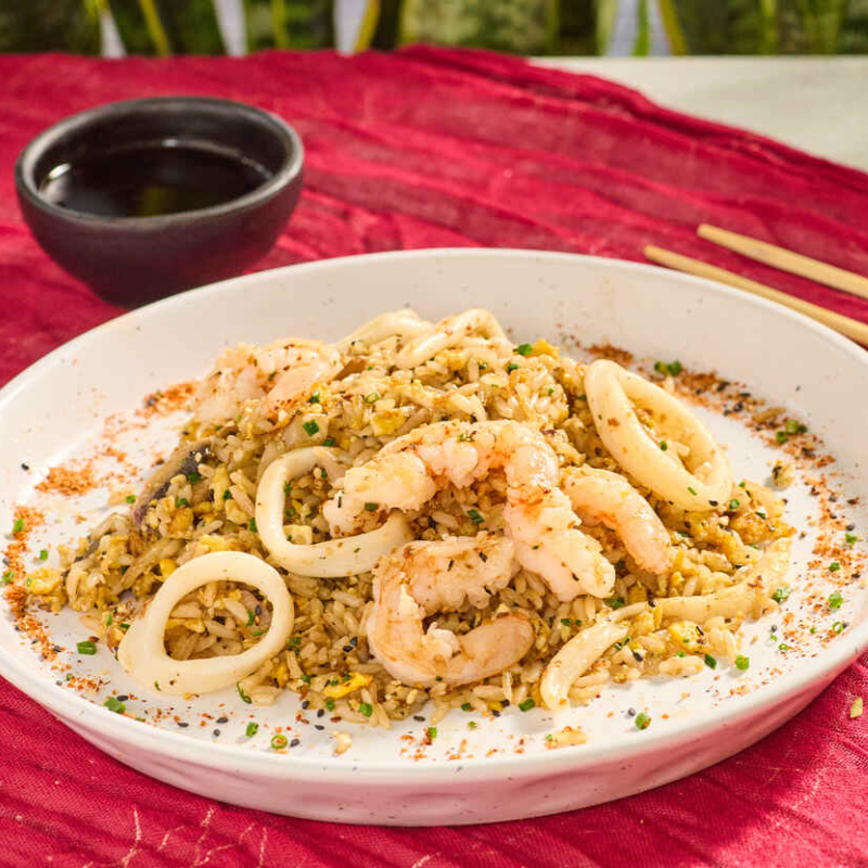 Delicioso Arroz salteado con camarones, calamar y vegetales frescos