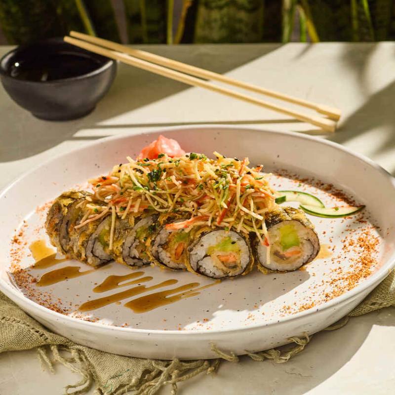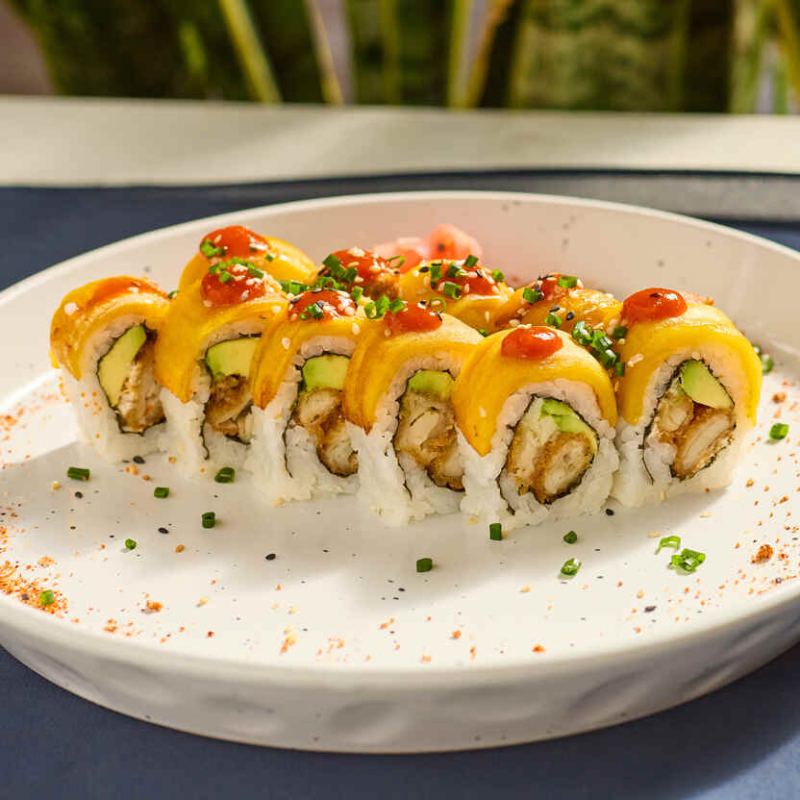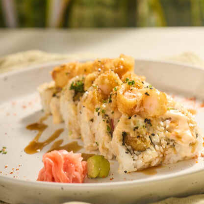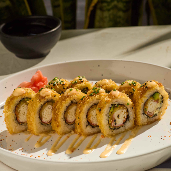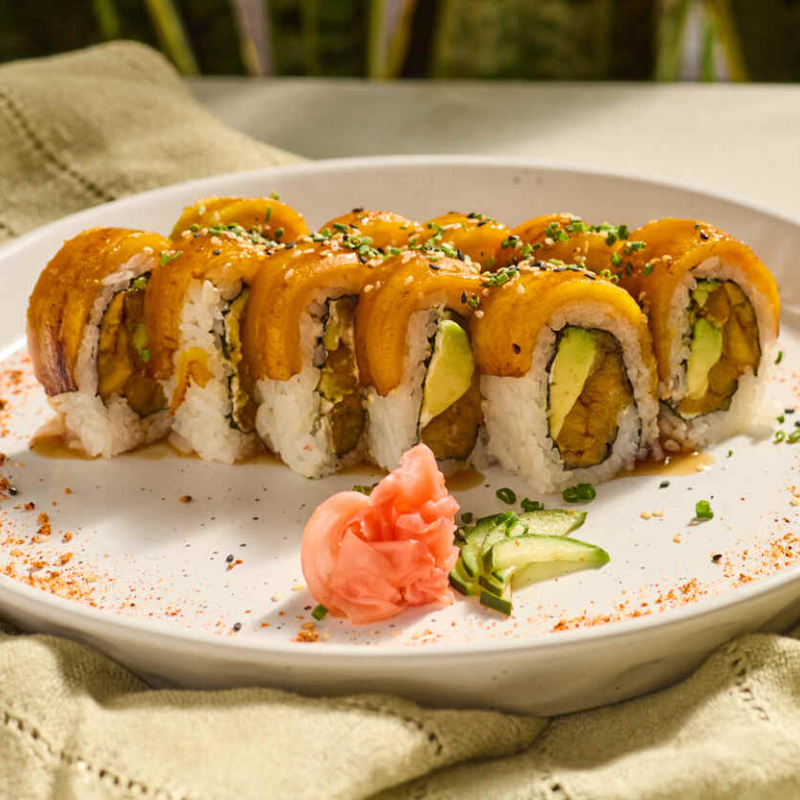 Roll a base de plátano maduro, camarones apanados, palmitos de cangrejo, queso crema y aguacate. Finalizado con salsa dragón y teriyaki de la casa, ajonjolí y cebollín.