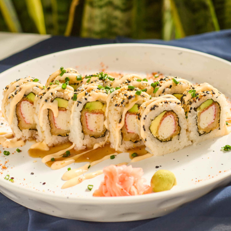 Palmitos de cangrejo, queso crema y aguacate. Camarones apanados y salsa dragón y teriyaki de la casa, ajonjolí y cebollín.