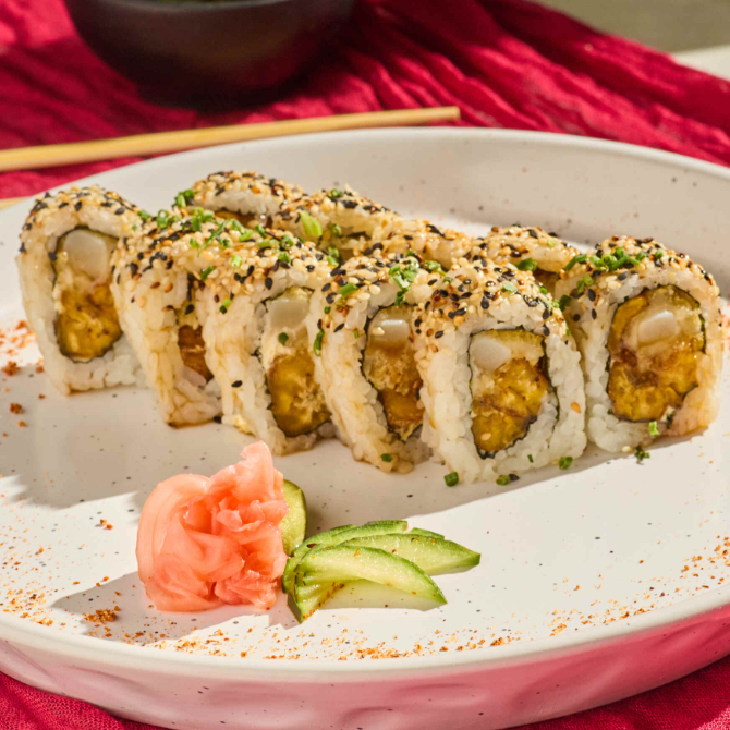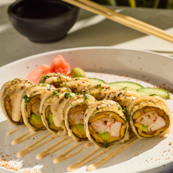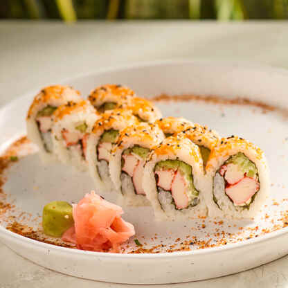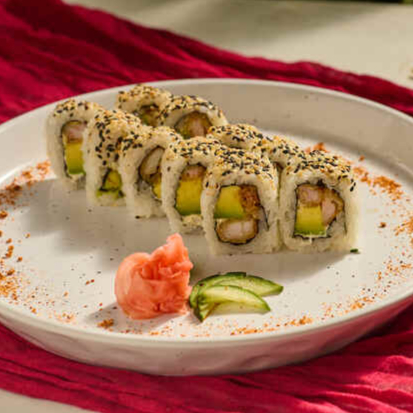Sushi tradicional al estilo hamachi sushi, kanikama, pepino y queso crema. Finalizado con masago y ajonjolí.