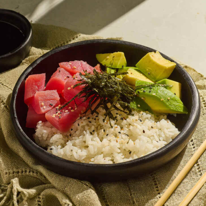 Delicioso poke base de arroz de sushi, aguacate, atun fresco y alga nori