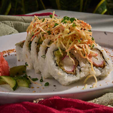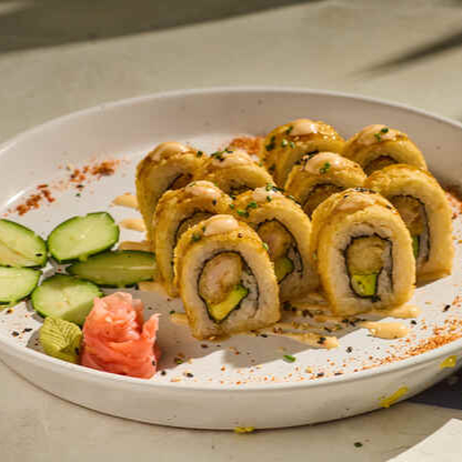 Salmon fresco, aguacate, queso crema. Finalizado con ensalada dinamita de la casa, ajonjolí y cebollín. Tempurizado.