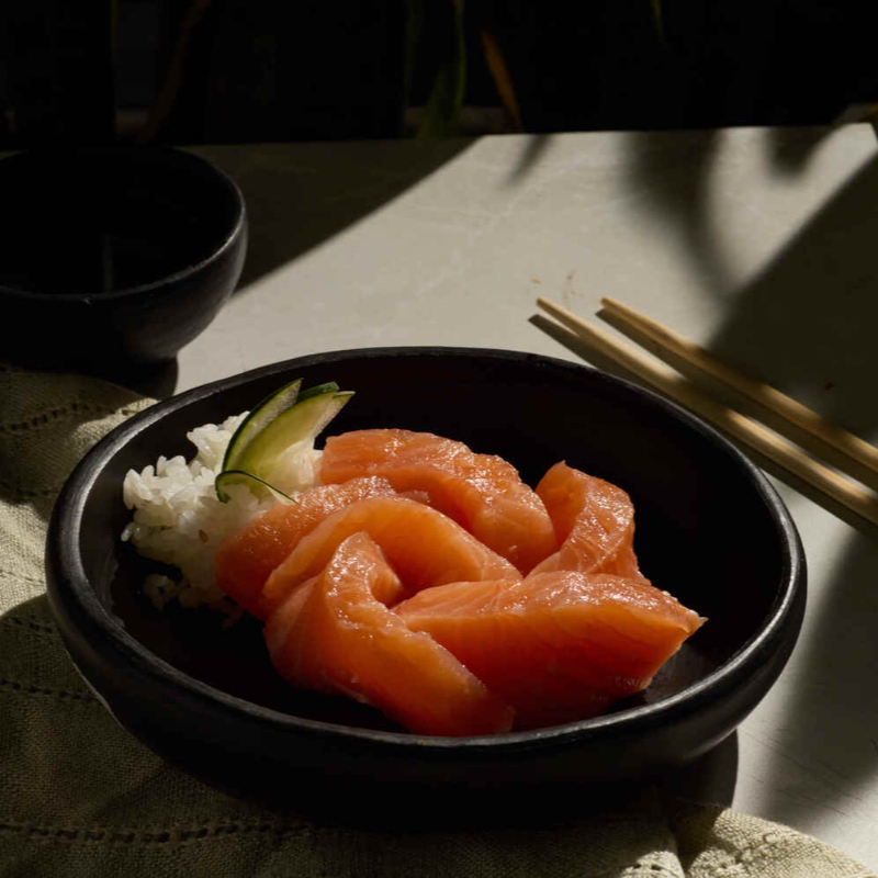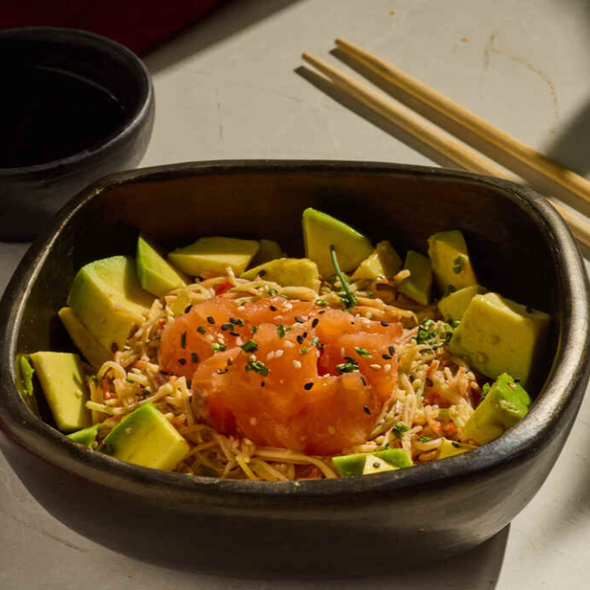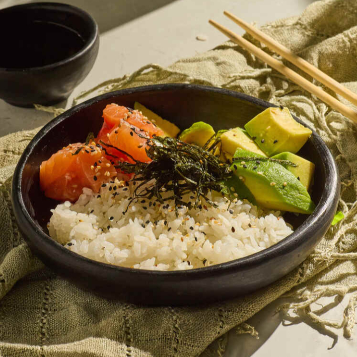 Delicioso Poke con base de arroz de sushi, aguacate, salmon fresco y alga nori