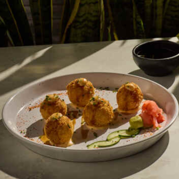 Esferas de cangrejo con queso crema y finalizado con salsa de la casa