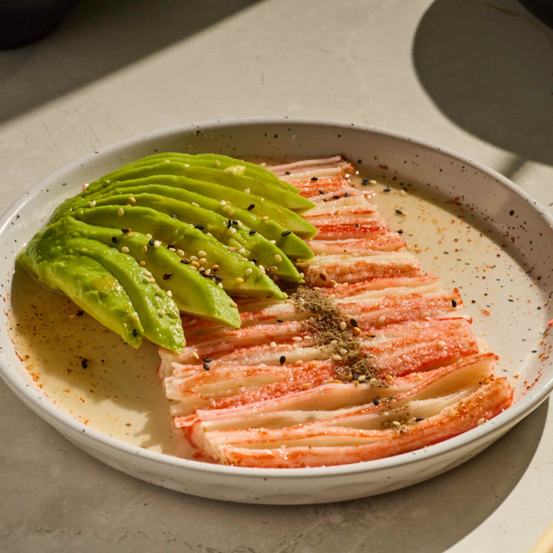 Cangrejo, queso crema y aguacate. Finalizado con ajonjolí encostrado y salsas de la casa.