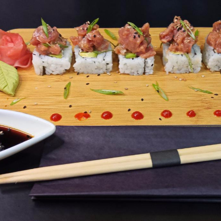 SUSHI 10 PZ CON ATUN ,CEBOLLIN, SIRASHA, MAGO, MASAGO, TOPPING DE ALCAPARRAS FRITAS