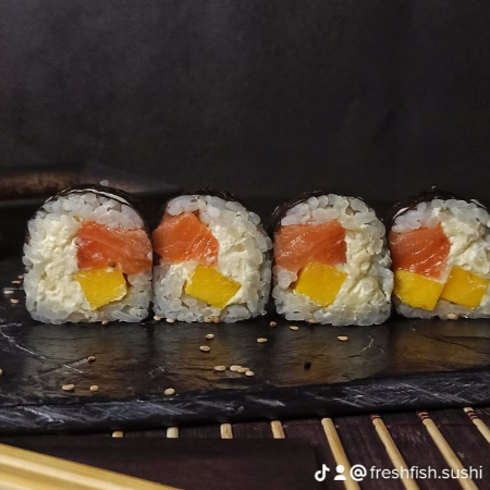 Rollo con nori, por fuera arroz de sushi, palmito apanado, queso crema, mango maduro y salsa triyaki.