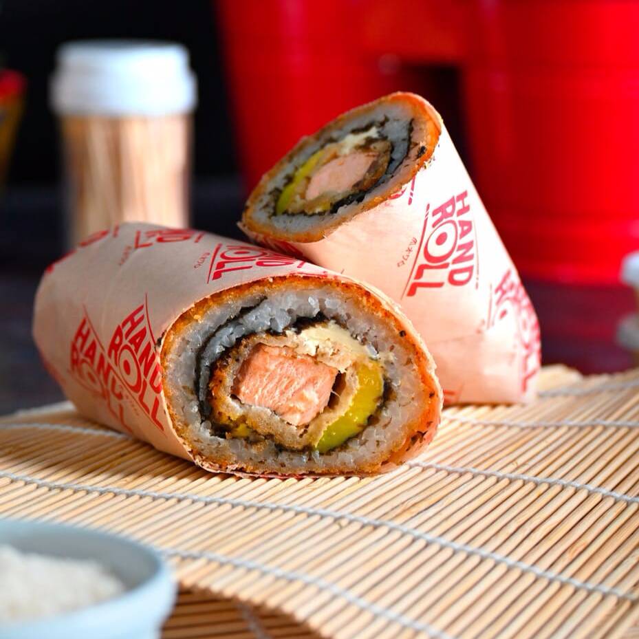 Hand roll apanado con base de arroz, nori, filete de salmon apanado, queso crema y aguacate.