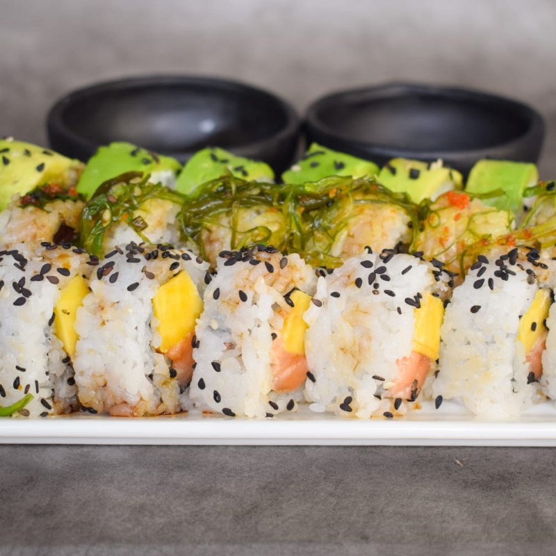 Sushi relleno de mango maduro, laminas de salmón fresco, queso crema. topping de ajonjolí.