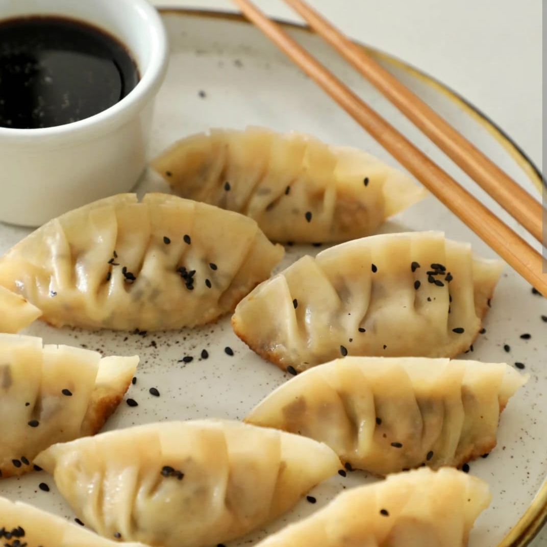 Empanaditas japonesas rellenas de camarónes, acompañadas con salsa soya.