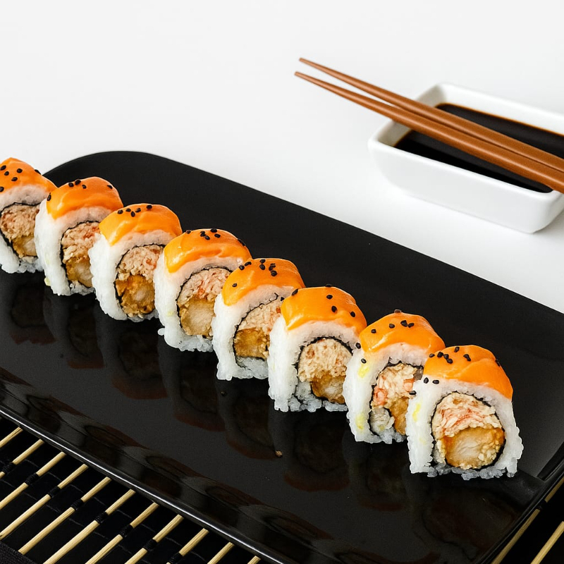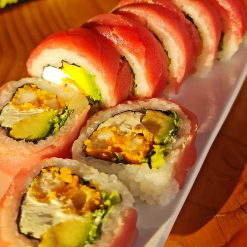 Sushi relleno de palmitos de cangrejos apanados, queso crema, aguacate, topping de atún fresco. acompañado de salsa soya.