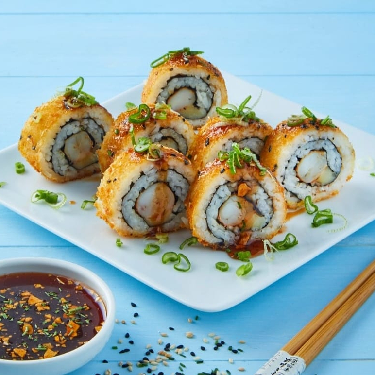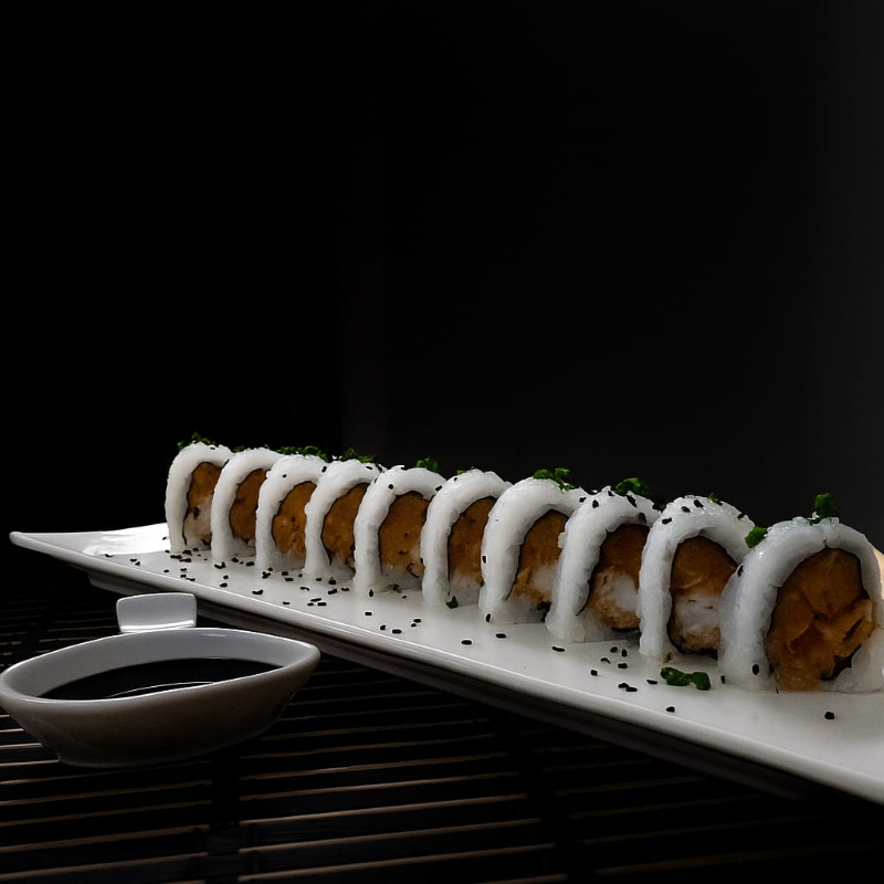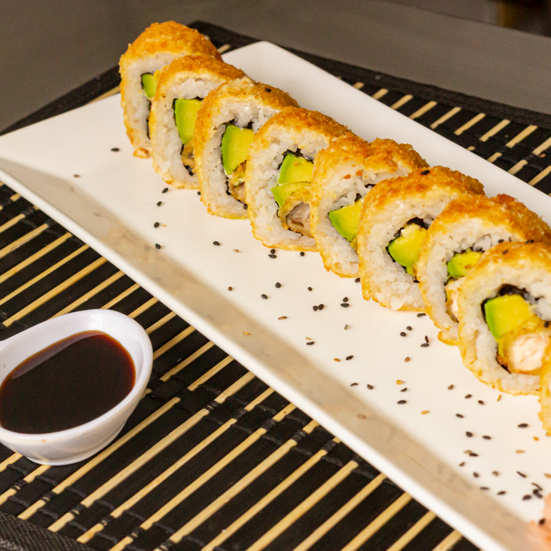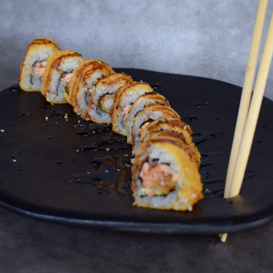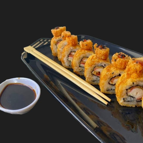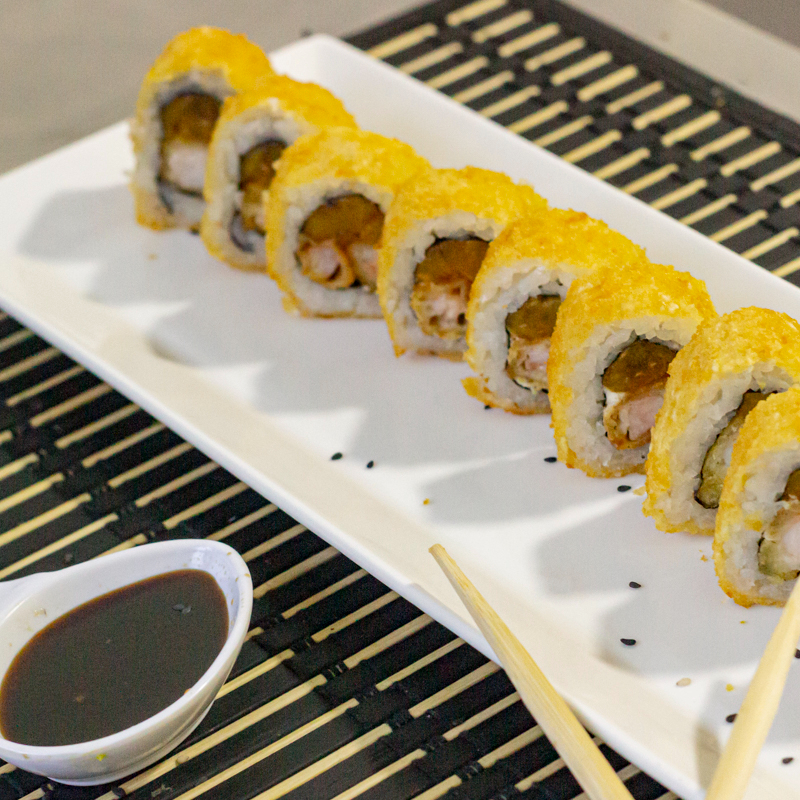 Sushi apanado relleno de camarones apanados, queso crema, topping de kanís esmechados, finalizado con salsa teriyaki, topping de ajonjolí.