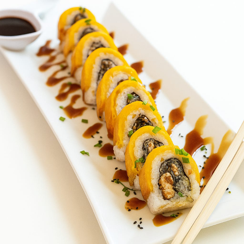 Sushi relleno de aros de calamar apanados, queso crema, topping de laminas de aguacate y plátano maduro. finalizado en salsa teriyaki.