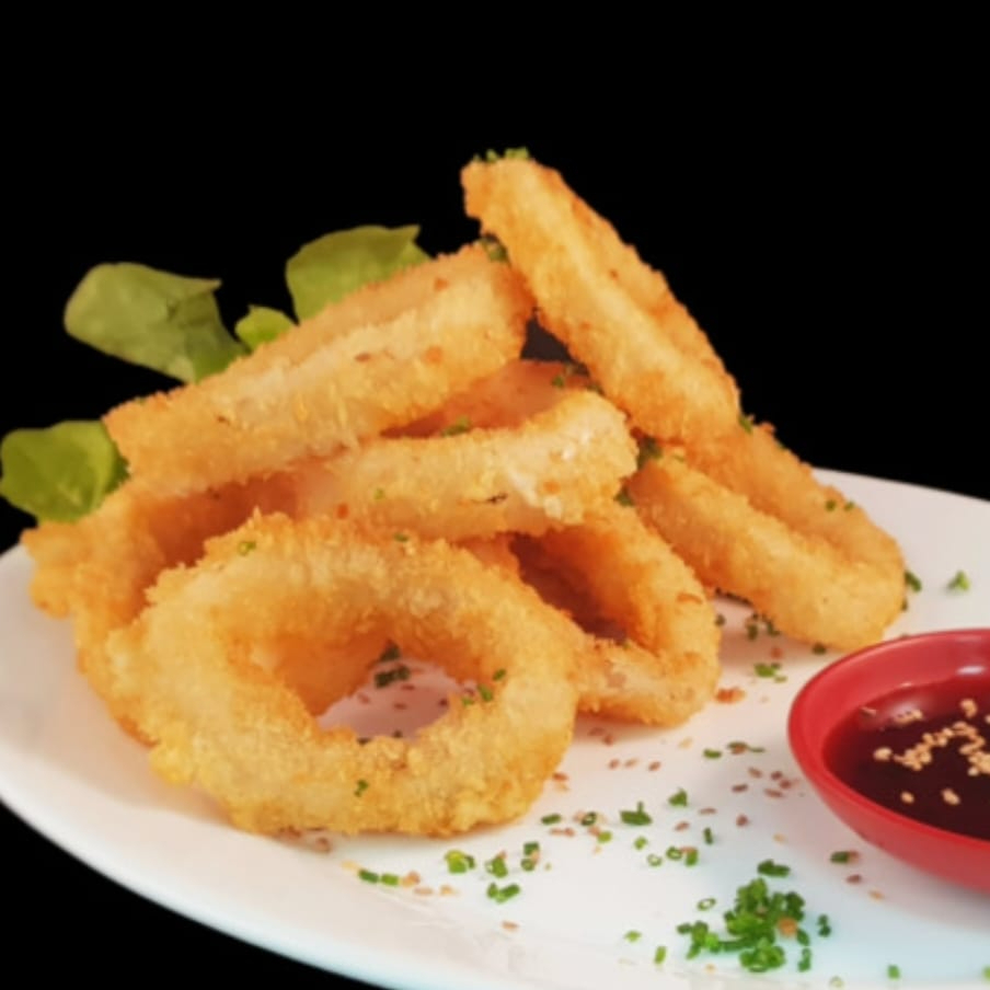 Calamares apanados (crocantes), acompañados con salsa teriyaki.