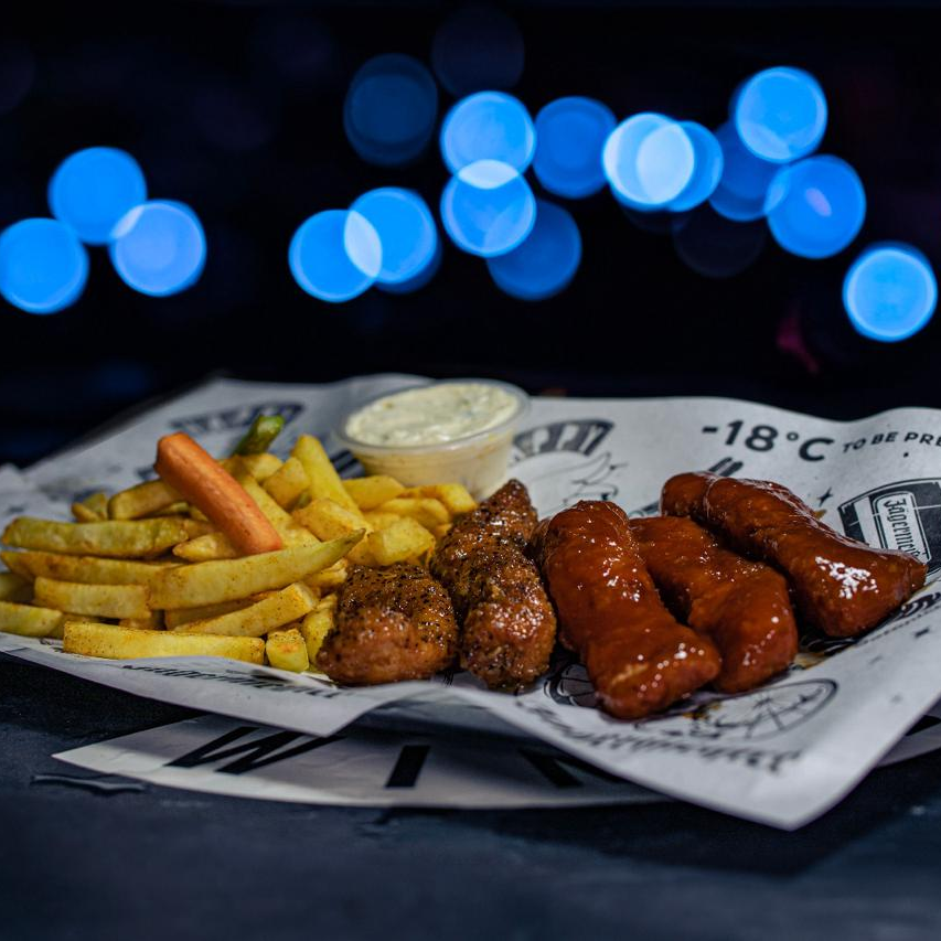 Papas a la francesa, chicken pops bañados en la salsa de tu eleccion, salchicha americana, queso, ensalada coleslaw y sour cream.