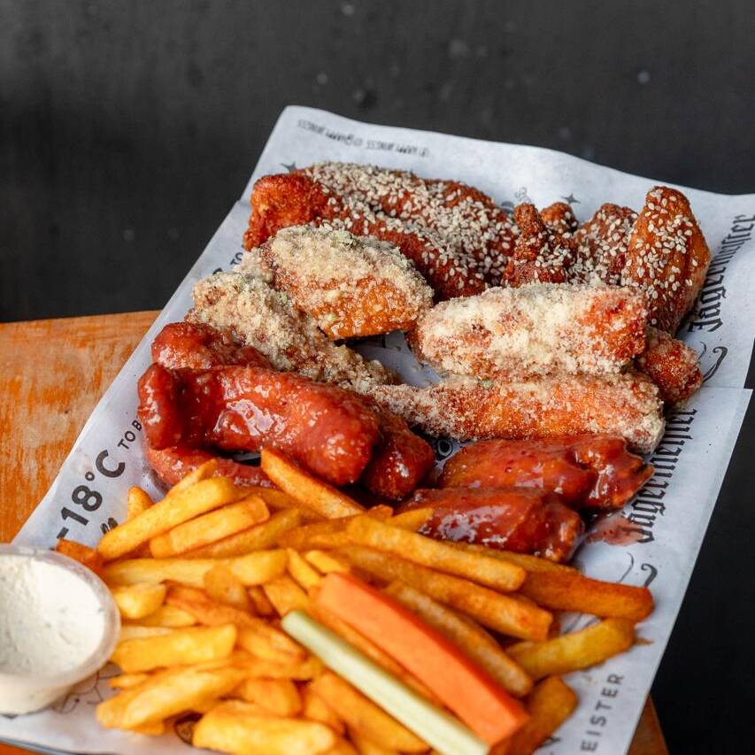 24 Piezas de alitas con 2 porción de papas, 2 sour cream, 4 salsas a elección mas vegetales. para este combo solo podrás elegir 9 piezas en parmesano.