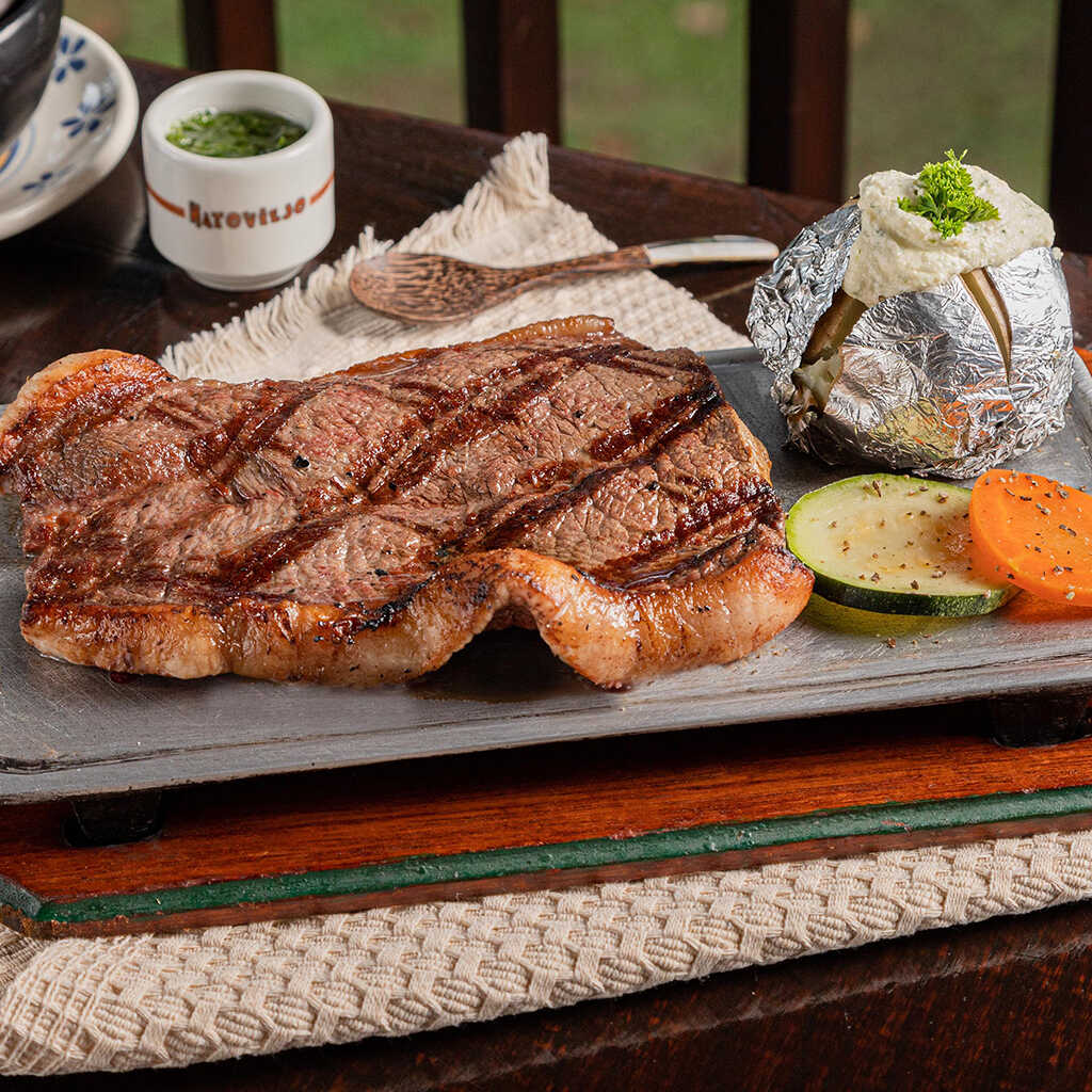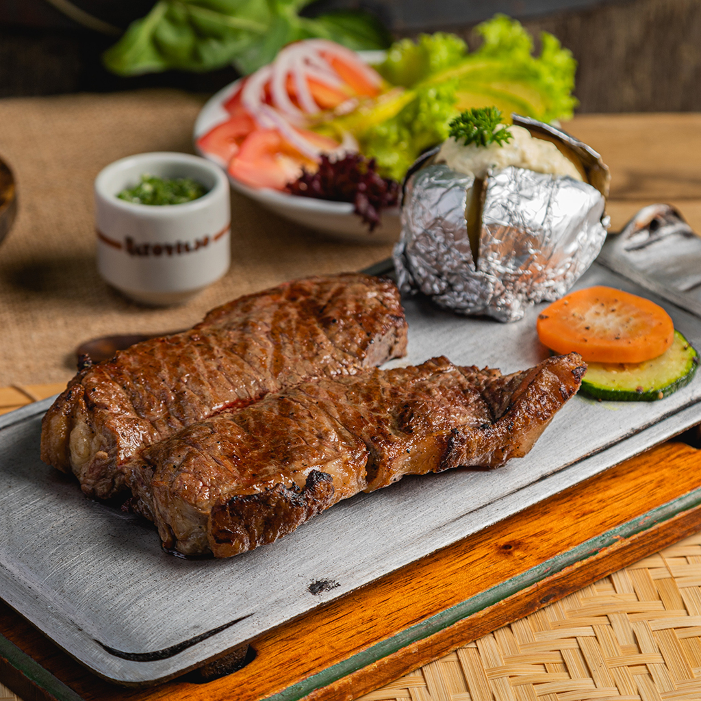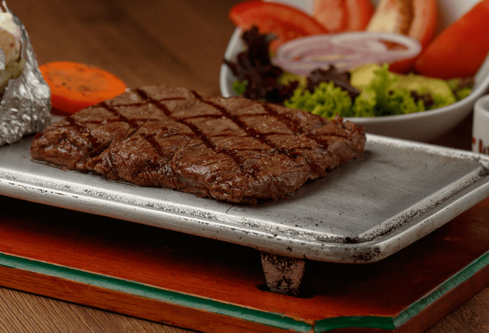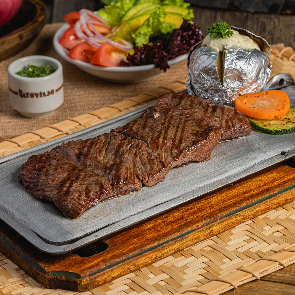 Churrasco de 320 g a la plancha con papa asada y ensalada de la casa.
