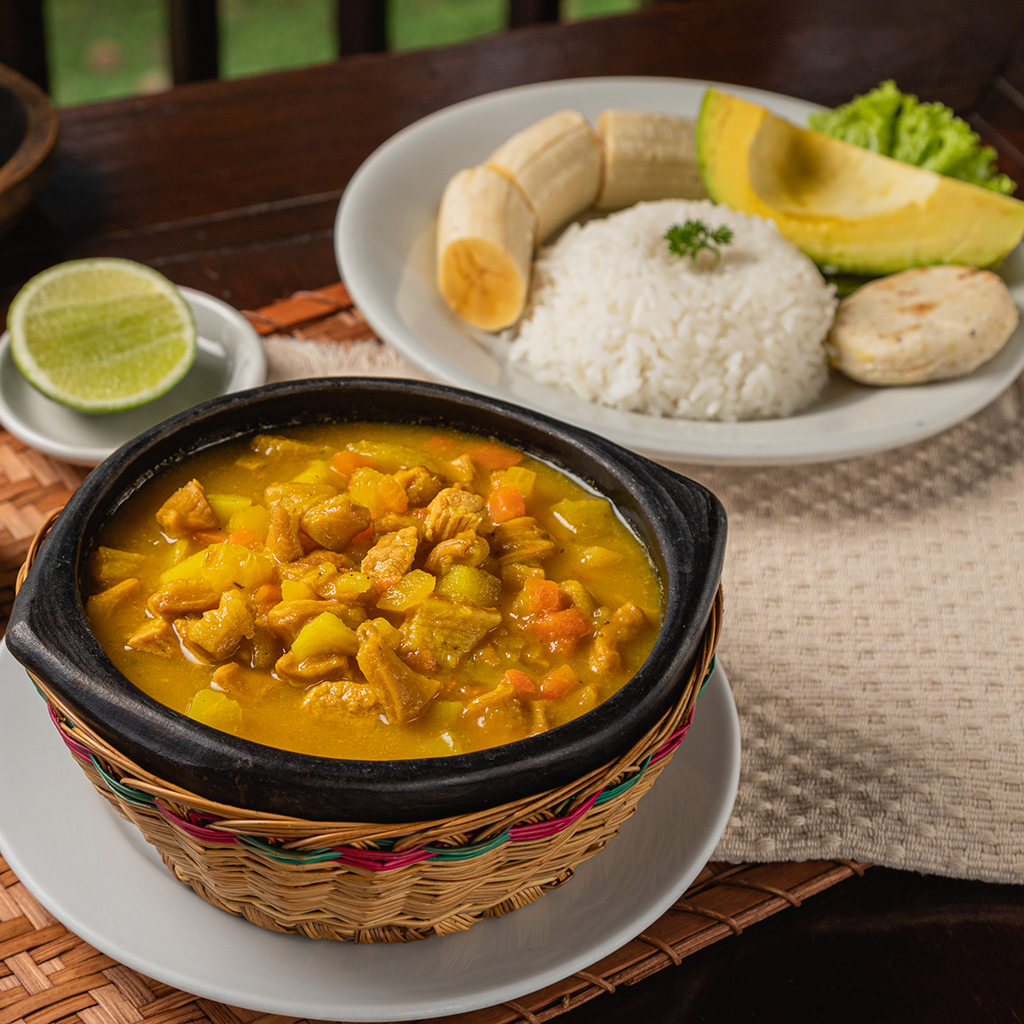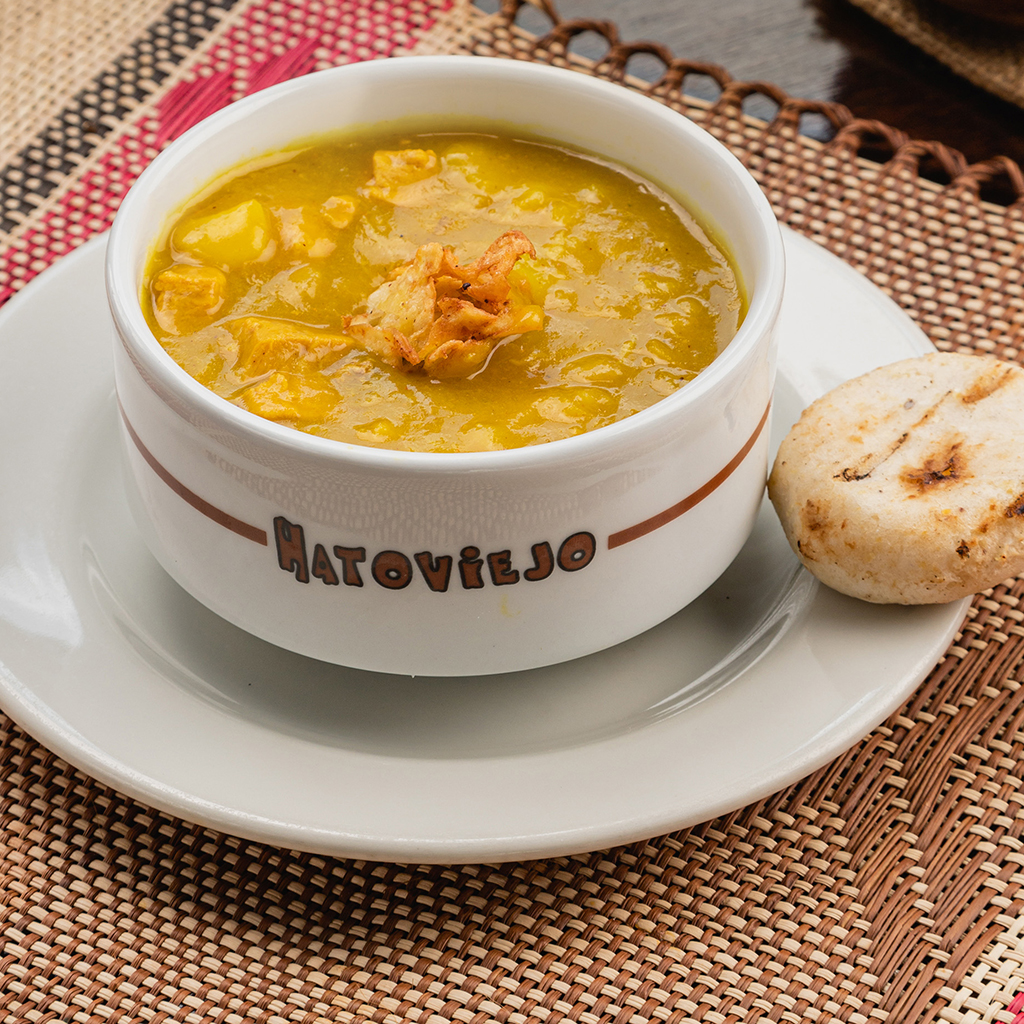 Sopa tradicional de panza de res, cerdo, papa y verduras, acompañada de banano, arroz, arepita y aguacate