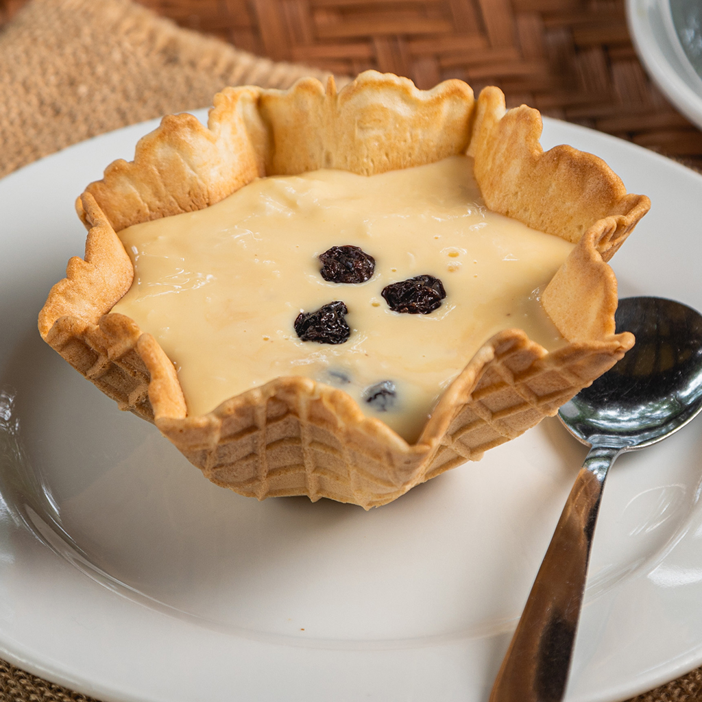 Postre de nata con pasas en galleta de cucurucho.