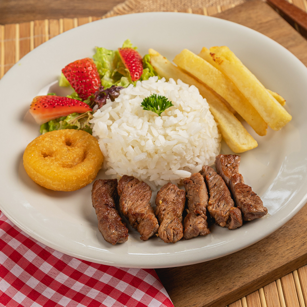 Carne de res en julianas con papas a la francesa, arroz y fresitas.