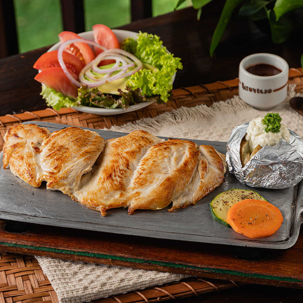 Pollo marinado de 200 g a la plancha, con papa asada y ensalada de la casa, término único.