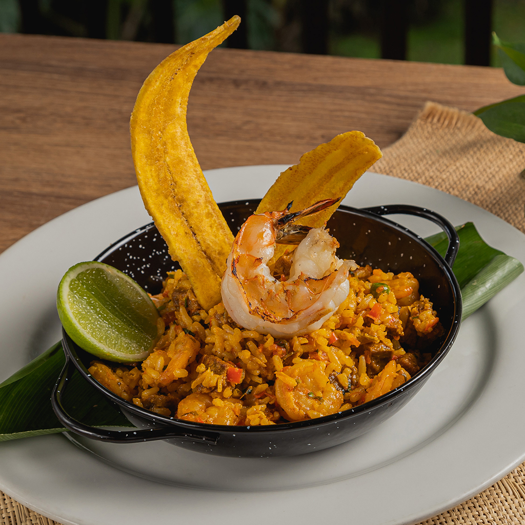Arroz atollado en sofrito, con camarones y trocitos de posta de res y verduras, finalizado con un toque de leche de coco, cilantro; decorado con un langostino a la parrilla y chips de plátano