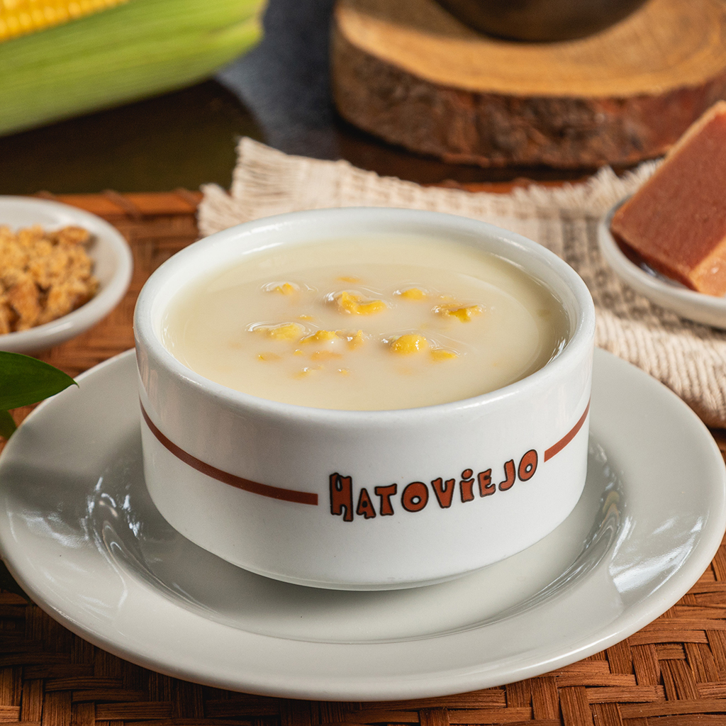 Bebida de maíz cocido en leche acompañada de bocadillo o arequipe.