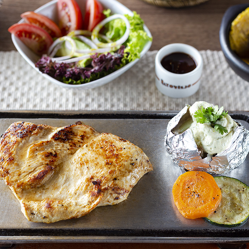 Pollo marinado de 300 g a la plancha, con papa asada y ensalada de la casa, término único.