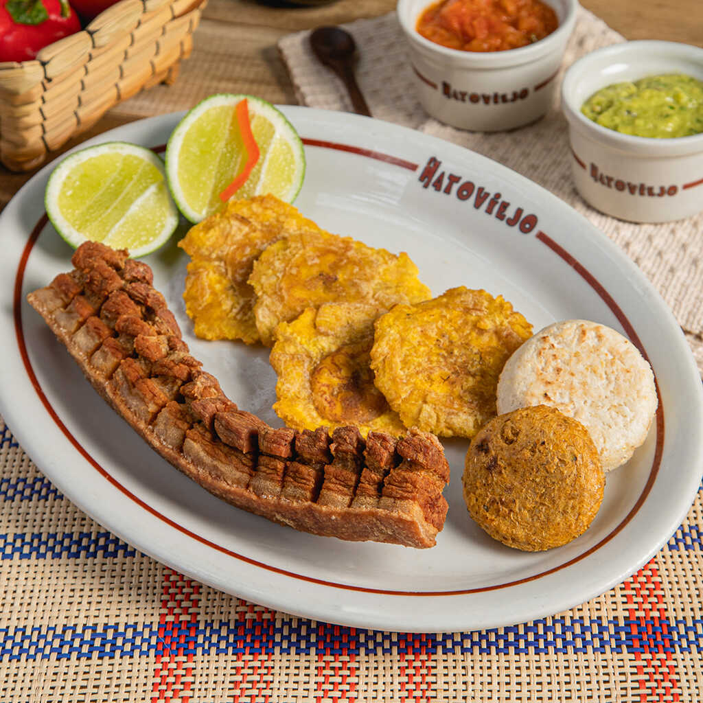 Chicharrón crujiente y carnudo, servido con patacón, arepa, hogao, guacamole y limón.